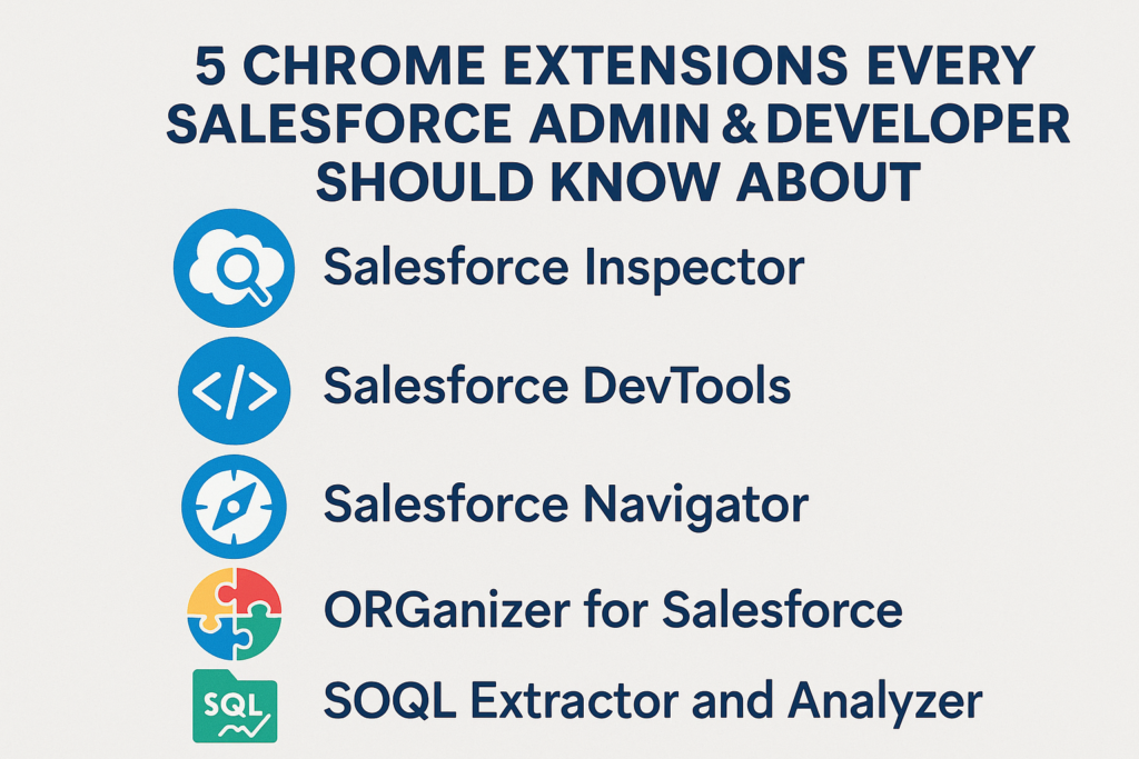 5 Chrome Extensions Every Salesforce Admin & Developer Should Know About Salesforce is one of the most powerful CRM and cloud platforms, but working with it daily as an Admin or Developer can sometimes feel overwhelming. Navigating between orgs, checking metadata, troubleshooting errors, and managing data — all of it can take up valuable time.